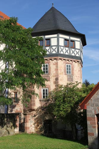 Ein polygonaler Turm ist an die äußere Ecke des Blauen Schlosses angesetzt. Die unteren Stockwerke stammen noch aus der Zeit, als die Anlage eine wehrhafte Burg war. Damals war vor dem Turm ein Wassergraben, und der mittelalterliche Turm schützte den schmalen Zwinger. Christoph von der Tann war der Erbauer der oberen Stockwerke des Turmes, denn er ließ auf die vorhandene Basis 1574 drei Stockwerke im Stil der Renaissance aufsetzen, nachdem er die Burg als Fuldaer Lehen von seinem Vater Melchior übernommen hatte. Die unteren zwei Geschosse des Turmes verschwanden in der Erde, als der Burggraben zugeschüttet wurde. Die neuen Geschosse bestehen aus verputztem Bruchsteinmauerwerk mit Eckquaderung. Das auf eng gesetzten Steinkonsolen vorkragende oberste Geschoß besteht aus Fachwerk und trägt einen polygonalen, verschieferten Helm. Der Turm überstand unverändert die barocke Erneuerung im frühen 18. Jh.
