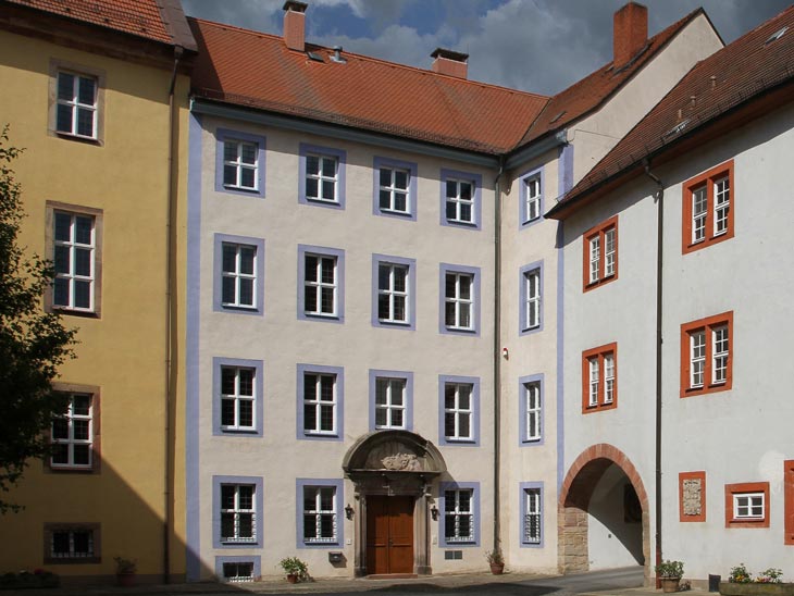 Innenhof der drei Tanner Schlösser, Blaues Schloß in der Mitte mit Prunkportal, in dessen Segmentbogengiebel sich der verwitterte Wappenstein befindet, Gelbes Schloß links angesetzt, Rotes Schloß rechts inclusive der Tordurchfahrt zur Stadt.