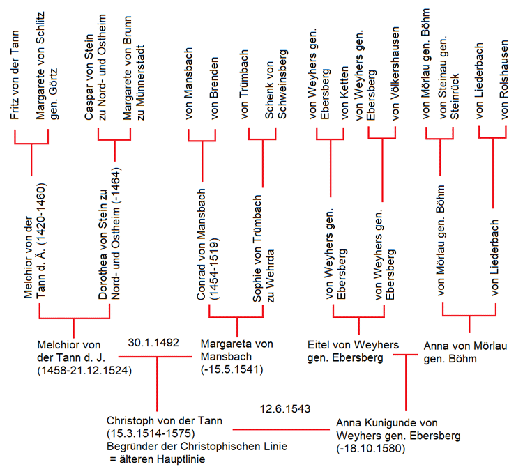 Ahnen von Christoph von der Tann: https://gw.geneanet.org/cvpolier?lang=en&n=von+der+tann&oc=0&p=christoph - https://gw.geneanet.org/cvpolier?lang=en&iz=0&p=melchior&n=von+der+tann - https://gw.geneanet.org/cvpolier?lang=en&iz=0&p=margareta&n=von+mansbach - https://www.geni.com/people/Christoph-von-der-Tann/6000000074781984995 und abhängige Seiten