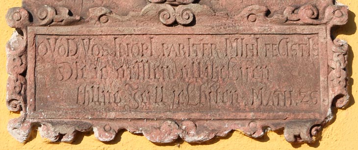 Darunter befindet sich in einer rechteckigen, von Rollwerk eingefaßten Tafel eine zweite Inschrift des Wortlauts: "QVOD VOS IN OPI PARITER MIHI FECISTIS" in der ersten Zeile, was als Chronogramm V + D + V + I + I + I + M + I + I + C + I + I = 5 + 500 + 5 + 1 + 1 + 1 + 1000 + 1 + 1 + 100 + 1 + 1 = 1617 ergibt. Darunter stehen zwei Zeilen aus dem Matthäus-Evangelium, die zum Zweck des Gebäudes passen.