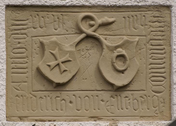 Außen ist ein historischer Wappenstein in die Wand eingelassen. Der heraldisch rechte Schild trägt das achtspitzige Johanniterkreuz, silbern in rotem Feld zu tingieren; der andere Schild verweist, wie die umlaufende Inschrift in der unteren Horizontalzeile besagt, auf den Komtur Friedrich von Enzberg, welcher 1480-1507 Chef der Johanniterkommende Schwäbisch Hall war. Ein weiteres Wappen dieses Komturs ist übrigens an der ehemaligen Johanniterkommende in Hall in der Heimbacher Gasse 2 zu sehen. Das Wappen der Herren von Enzberg zeigt in Blau einen goldenen, mit einem roten Stein versehenen Fingerring. Die hier nicht dargestellte Helmzier wäre zu blau-goldenen Decken auf einem roten Kissen der Fingerring wie im Schild. Das Wappen wird beschrieben im Siebmacher Band: Bad Seite: 19 Tafel: 12, Band: Els Seite: 7 Tafel: 9, Band: Wü Seite: 7 Tafel: 8. Gleicherweise sind die Darstellungen im Codex Ingeram (dort Helm gekrönt, kein Kissen), im Wernigeroder Wappenbuch (ohne Kissen) und im Alten Siebmacher (dort ein blaues Kissen) tingiert. Abweichend ist die Darstellung im Scheiblerschen Wappenbuch (Folio 238) mit rot-silbernen Decken, ebenfalls ohne Kissen in der Helmzier. Die Familie hatte ihr 1384 zerstörtes Stammhaus Enzberg in der Nähe des Klosters Maulbronn, dessen Schirmvögte sie stellte. Heute gehört Enzberg zur Stadt Mühlacker. Die Familie war später ab 1409 in Mühlheim/Donau (Lkr. Tuttlingen) begütert, wo sie die Vogtei über das Kloster Beuron innehatte und wo sie noch heute auf dem Schloß lebt. Die Herren von Enzberg sind stammesverwandt und wappenverwandt mit den von Dürmenz (Dürrmenz, vgl. Siebmacher Band: Els Seite: 6 Tafel: 8, Band: WüA Seite: 85 Tafel: 49, mit widersprüchlichen Tinkturangaben) und den Herren von Niefern (vgl. Siebmacher Band: WüA Seite: 251 Tafel: 142, ebenfalls mit dem Fingerring als Schildbild). Weitere Wappen gibt es im Inneren der Kirche: Am Altarbogen befindet sich das Wappen des Komturs Joseph von Forell, und im Chor ist die auf das Jahr 1592 datierte Grabplatte des Komturs Gottfried von Heppenheim zu sehen (jeweils ohne Abb.).