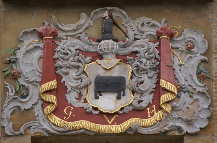 Das Wappen des Bauherrn ist in der Mittelachse hoch über der Tür angebracht und trennt zwei Fenster. Der Hintergrund wird wie bei der Inschrift aus weißen Rocaille-Ornamenten und bunten Blümchen im verspielten Stil des Rokoko gebildet. Darauf ist ein roter, beiderseits hochgeraffter Wappenmantel ausgebreitet, mit goldenen Fransen unten und den Initialen des Bauherrn G. V. H. für Gottfried vom Holtz. Das Wappen zeigt in Silber eine schwarze Truhe mit Beschlägen, auf dem Helm mit schwarz-silbernen (hier nicht dem entsprechend) Decken ein wachsender Rumpf eines schwarz mit goldenen Knöpfen gekleideten Mannes mit Spitzbart und hinten abstehendem Haarzopf. Das Wappen wird beschrieben im Rahrbach S. 126, im Alberti S. 344, im Siebmacher Band: Bad Seite: 55 Tafel: 34 sowie im Siebmacher Supplement IV 30.