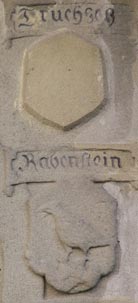 Hans Conrad von Wollmershausen (1576-21.2.1640) war seit dem Jahr 1600 mit Amalia Rosina Truchseß von Pommersfelden (1579-1638) verheiratet. Dem entspricht das zentrale Ehewappen, rechts von Wollmershausen (in Rot zwei silberne Balken, auf dem Helm mit rot-silbernen Decken ein silbern oder mit Hermelin gestulpter roter Spitzhut, mit zwei silbernen Balken belegt, oben mit einem schwarzen Hahnenfederbusch besteckt), links Truchseß von Pommersfelden (in Silber ein blauer, rotgezungter, golden gekrönter und ebenso bewehrter Löwe, überdeckt von zwei roten Balken, auf dem Helm mit blau-silbernen Decken der Löwe wachsend, überdeckt von zwei roten Balken - hier nur ein Balken in der Helmzier).