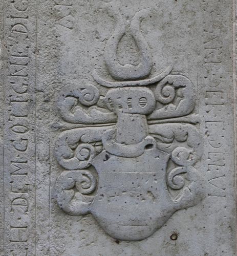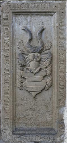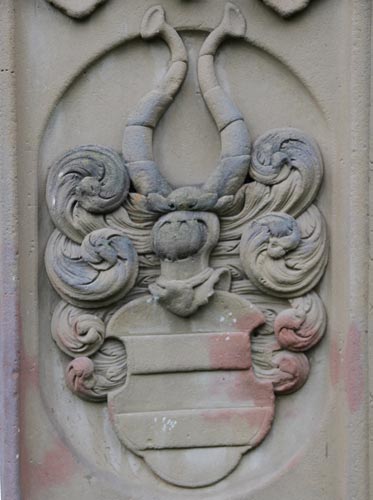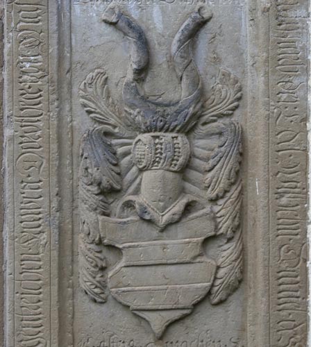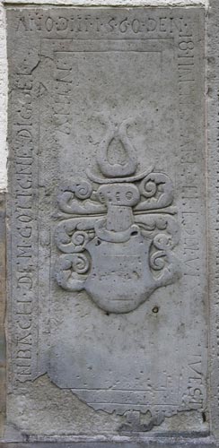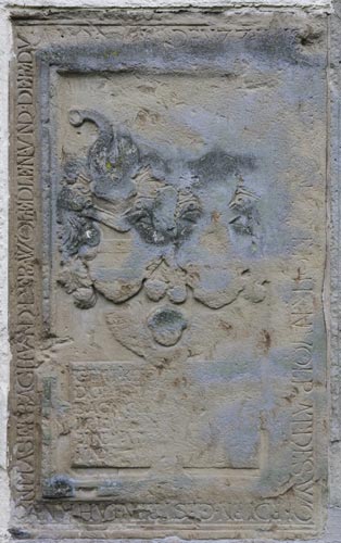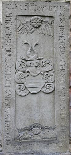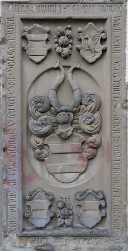 Bei dem Verstorbenen handelt es sich um Christoph Wilhelm von Massenbach (1558-8.3.1591), vermählt mit Martha von Helmstatt. Da er keine männlichen Erben hatte, erlosch diese Linie mit ihm und wurde danach von der norddeutschen Linie neu besetzt. Im Innern der Kirche steht ein aufwendiges Renaissance-Epitaph (ohne Abb.) für ihn in der Grafenloge, gleichfalls eine Arbeit des Bildhauers und Baumeisters Jakob Müller. In der Mitte der Platte befindet sich ein Vollwappen der von Massenbach, in Blau zwei goldene Balken, auf dem Helm mit blau-goldenen Decken zwei blaue, jeweils mit zwei goldenen Spangen belegte Büffelhörner.