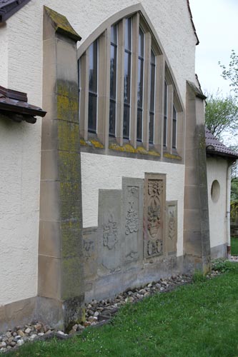 Die historische Kirche von Massenbach wurde 1912 abgerissen, um Platz für einen größeren Neubau zu schaffen, der 1913 geweiht werden konnte. Die Pläne zur Erweiterung bestanden schon ab ca. 1870. 1897 trug man den alten Friedhof, dessen Niveau einen Meter über dem heutigen Bodenniveau lag, ab. Hier befand sich die Grablege der Herren von Massenbach, die bis 1927 das Patronatsrecht innehatten. Den Aushub mit den sterblichen Überresten der Bestatteten verteilte man auf den umliegenden Feldern. Einige der alten Grabplatten wurden an der östlichen Giebelaußenseite der neuen Kirche in die Wand eingelassen; diese werden in diesem Kapitel beschrieben. Die wertvollen, ebenfalls wappengeschmückten Epitaphien stehen nach wie vor im Innern der Kirche.