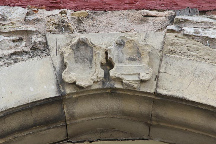 Über der Tordurchfahrt zwischen beiden Baugruppen befindet sich das Ehewappen (eine Restaurierung aus dem 20. Jh.) von Wolf Conrad II. Greck von Kochendorf (1561-23.5.1614) und seiner Frau Benedicta von Gemmingen (20.8.1572-1.8.1628). Das Wappen der Greck von Kochendorf ist golden-blau geteilt, auf dem Helm mit blau-goldenen Decken zwischen zwei golden-blau geteilten Büffelhörnern eine wachsende, blau gekleidete Jungfrau, deren Kranz im Haar mit drei großen Blättern besteckt ist und die beide Hände auf die Brust legt. Das Wappen der Herren von Gemmingen zeigt in Blau zwei goldene Balken, auf dem Helm mit blau-goldenen Decken zwei Büffelhörner, die jeweils mit zwei goldenen Spangen umgeben sind.