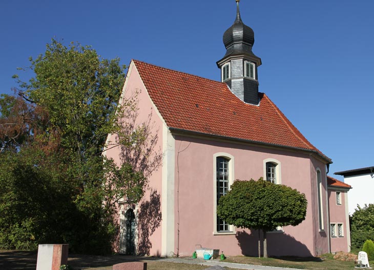Die optisch linke Kartusche enthält ein verschlungenes Monogramm, dessen Buchstaben FFA für Herzog Franz Friedrich Anton von Sachsen-Coburg-Saalfeld (15.7.1750-9.12.1806) stehen, der 1800-1806 regierte. Er war der Sohn von Ernst Friedrich Herzog von Sachsen-Coburg-Saalfeld (8.3.1724-8.9.1800) und Sophia Antoinette Prinzessin von Braunschweig-Wolfenbüttel (23.1.1724-17.5.1802), und er hatte am 6.3.1776 in erster Ehe in Hildburghausen Ernestine Friederike Sophie Herzogin von Sachsen-Hildburghausen (22.2.1760-28.10.1776) geheiratet, danach in zweiter Ehe am 13.6.1777 in Ebersdorf Augusta Carolina Sophia Gräfin Reuss-Ebersdorf (19.1.1757-7.11.1831). Das Auftreten dieser Initialen ist eine Besonderheit, weil diese kleine Kirche die einzige nennenswerte kirchliche Baumaßnahme unter diesem Coburger Herzog war. Bedeutender waren seine Leistungen auf anderen Gebieten, z. B. als Sammler von Büchern und Graphiken. Er begründete die heute auf der Veste Coburg aufbewahrte Kupferstichsammlung mit insgesamt 300000 Graphiken, und seiner Sammelleidenschaft verdankte die Schloßbibliothek Coburg bedeutende Zuwächse. Seine naturwissenschaftliche Sammlung bildete den Grundstock des Naturkundemuseums Coburg. Als Staatsmann war er hingegen schwach und nicht das, was das kleine Herzogtum in jener Zeit gebraucht hätte.