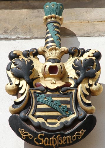 Abb. links: Wappen des Herzogtums Sachsen ("Sachssen") an der rechten Seitenwand des Altanvorbaus. Als einzelnes Vollwappen kommt es auch am Roten Schloß in Weimar vor. Das Wappen wird auch im Sächsischen Stammbuch vollständig abgebildet ("Sachssen"), es ist dort gewendet und zeigt dort wie hier einen golden-schwarz neunmal geteilten Schild (heute umgekehrte Abfolge üblich), darüber einen schrägrechten grünen Rautenkranz gelegt, auf dem gekrönten Helm mit schwarz-goldenen Decken ein wie der Schild bezeichneter hoher Hut, an der Spitze mit einem Pfauenfederbusch besteckt. Dieses Wappen ist unverzichtbarer Standardbestandteil aller sächsischen Wappen. Das Schildbild stammt aus der Zeit der Askanier und ging später 1423 auf die Wettiner mit der Übernahme von Namen und Land über. Die Askanier hatten einen gespaltenen Schild, vorne als Markgrafen von Brandenburg den roten brandenburgischen Adler am Spalt in Silber, ihr eigentliches Geschlechtswappen, hinten die schwarz-goldenen Teilungen ohne Rautenkranz, das Wappen von Ballenstedt. Diesen aus Brandenburg und Ballenstedt gespaltenen Schild zeigt z. B. die Züricher Wappenrolle, desgleichen die Heidelberger Handschrift des sächsischen Land- und Lehensrechtes. Heute sehen wir genau neun Teilungen als korrekt an, damals unterlag die Anzahl noch einer größeren Variationsbreite. Die Helmzier war ein breitkrempiger, oben mit einem Pfauenstoß besteckter Hut. Im Laufe der Entwicklung wurde daraus ein Spitzhut oder Schaft, der mit dem Schildbild belegt wurde. In der zweiten Hälfte des 13. Jh. (1261) erscheint der Rautenkranz als Beizeichen zur Differenzierung. Ein Zweig mit Blättern wurde schräg über den Schild gelegt. Der Rautenkranz war also ursprünglich eine Wappendifferenzierung des alten Askanierwappens durch den jüngeren Bruder Albrecht von Sachsen, während Heinrich von Aschersleben das Askanierwappen unverändert (von Schwarz und Gold neunmal geteilt) führte. Der Wappenstein ist eine Neuanfertigung aus dem Jahr 1896. Er wurde in den 1980er Jahren farbig gefaßt. Das stark verwitterte Original aus dem 17. Jh. existiert noch im Fundus des Schlosses.