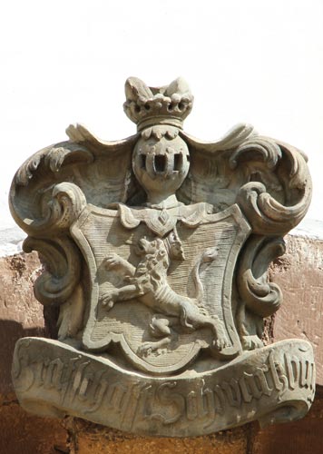 Abb. links: Wappen der Grafschaft Schwarzburg ("Grafschafft Schwartzburg") über der vierzehnten Arkade von links. Das Motiv taucht normalerweise nicht in vermehrten ernestinischen Wappen auf. Das Stammwappen der Grafen von Schwarzburg zeigt in Blau einen goldenen, gekrönten, eigentlich hersehenden Löwen. Die zugehörige, hier größtenteils fehlende Helmzier zeigt auf gekröntem Helm zu blau-goldenen Decken einen wachsenden goldenen Löwen, aus dessen Krone ein Pfauenstoß wächst. Die Helmzier hat im Laufe ihrer Geschichte viele Varianten durchlaufen, ehe sie sich in der heute bekannten Form durchsetzte, erstmals Mitte des 14. Jh. Ganz typisch für den Schwarzburger Löwen ist das dem Betrachter zugewandte Antlitz, sowohl im Schild als auch in der Helmzier, was hier aber im Schild nicht realisiert wird. Die Helmzier ist hier zwar abgebrochen, doch man kann an den beiden Knien noch erkennen, daß hier einst der Löwe frontal dargestellt war. Diese seltsamen Zipfel sind jedoch das Ergebnis einer Restaurierung 1999, denn schon 1981 fehlte die Helmzier. Diesen Löwen führen die Grafen von Schwarzburg und die Grafen von Kevernburg/Käfernburg (1385 erloschen), die beiden Hauptlinien des Geschlechtes. Die Grafen von Kevernburg trugen 1280 einen Teil ihres Besitzes dem Wettiner Albrecht dem Entarteten zu Lehen auf. Die nächste Erosion ihres Besitzes kam 1366, als Graf Johann II. von Schwarzburg-Wachsenburg die Wachsenburg und die Burg Liebenstein an der Gera an die Wettiner verkaufen mußte. 1385 zog Landgraf Balthasar den restlichen Besitz der Linie Schwarzburg-Kevernburg ein, nachdem Graf Günter XV., der letzte der Familie im Mannesstamm, auf einer Reise nach Jerusalem verstorben war. Dessen Ehefrau und dessen Mutter verkauften 1387 an Landgraf Balthasar von Thüringen alles, was noch an Landbesitz übrig war. 1446 kamen die Gebiete jedoch an die Grafen von Schwarzburg (1971 im Mannesstamm erloschen). Der Wappenstein wurde in der Mitte des 18. Jh. neu geschaffen, was die barockeren Formen der Helmdecke erklärt.