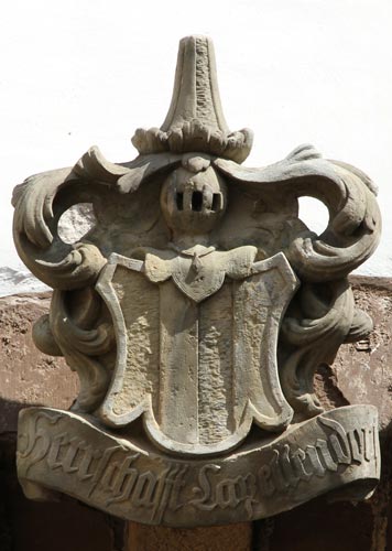 Abb. rechts: Wappen der Herrschaft Kapellendorf ("Herrschafft Capellendorf") über der fünfzehnten Arkade von links, der letzten in dieser Reihe, die aufgrund des Altans eine Arkade weniger besitzt als die Reihe am Westflügel. Das Motiv taucht normalerweise nicht in vermehrten ernestinischen Wappen auf. Die Herrschaft Kapellendorf führt in Schwarz drei silberne Pfähle (hier zu wenig, nur drei Spaltungen), auf dem Helm mit schwarz-silbernen Decken ein hoher, wie der Schild bez. Hut, eigentlich mit Aufschlag (fehlt hier), an der Spitze mit einem Federbusch besteckt. Das Wappen wird beschrieben im Alten Siebmacher II, Tafel 22 unter den Grafen als "Caplendorf", wird dort aber wie hier dargestellt, nämlich nur dreimal schwarz-silbern gespalten, und der Hut ist ohne Aufschlag. In anderen Quellen werden noch weitere Varianten angegeben, darunter eine farblich invertierte. Für die Stadt vgl. Siebmacher Band: St Seite: 300 Tafel: 290. Die Herrschaft Kapellendorf steht in engem Zusammenhang mit den 1149 in den Rang von Burggrafen erhobenen Herren von Kirchberg, die aus dem Ort Kapellendorf (ein Reichslehen) stammten, sich aber nach dem Amtssitz auf dem bei Jena gelegenen Hausberg nannten. Daher ist das Wappen auch dem der Burggrafen von Kirchberg entlehnt, auch wenn es hier nur in reduzierter Form zu sehen ist. Da das Wappen der Burggrafen von Kirchberg aber in dieser Wappengalerie noch einmal separat erscheint (siehe nachfolgendes Kapitel), ist dieses Wappen hier differenziert, auch wenn die Stadt Erfurt das Wappen für Kapellendorf mit drei Pfählen geführt hat (Wappen am Erfurter Rathaus, Innenhof). Die Errichtung der ersten Burg Kapellendorf ist zeitlich ebenfalls in die Mitte des 12. Jh. einzuordnen. 1348 ging es den Burggrafen finanziell schlecht, so daß sie ihre Burg an die 40 km entfernte Stadt Erfurt verkauften. Der Verkauf lief über den Erfurter Strohmann Heinrich Hundolf, Bischof von Constantia, um den wahren Erwerber zu verschleiern. Für die Stadt war die Burg das Juwel des Erfurter Landgebietes. Der Ankauf war Teil einer von der Stadt Erfurt konsequent betriebenen Burgenpolitik. Da es ein Reichslehen war, sicherte es der Stadt das Ansehen einer Quasi-Reichsstadt. Die Stadt wurde am 10.11.1352 von König Karl IV. (erst seit 1355 Kaiser) offiziell mit der Burg belehnt und war damit über diese Burg reichsunmittelbar - politisch einer der ganz großen Höhepunkte Erfurts. Der Stadtrat Erfurts wurde aufgrund des Besitzes dieser Burg z. B. zu Reichstagen eingeladen und hatte in der Reichsversammlung Sitz und Stimme, obwohl man die Herrschaft des Mainzer Fürsterzbischofs nie offiziell abgeschüttelt hatte. Die Burg Kapellendorf bildete zugleich den östlichen Außenposten des Erfurter Territoriums nahe der Straße zwischen Weimar und Jena und hatte dadurch eine große strategische Bedeutung. Die Stadt Erfurt ließ die Burg 1350-1400 großzügig umbauen und erweitern, quasi neu bauen. Der Stadt Erfurt gehörte die Burg Kapellendorf aber nur bis 1509, damals wurde die Burg an die ernestinischen Wettiner verpfändet. Mit dem wirtschaftlichen Niedergang (Pest, Stadtbrand 1472, Kriege, nachlassende wirtschaftliche Bedeutung des Färberwaids) mußte auch die Herrschaft Kapellendorf aus Geldnot abgestoßen werden. Das Pfand wurde nie eingelöst; bis 1918 verblieb Kapellendorf bei Sachsen-Weimar. Aus ernestinischer Zeit stammt der barocke Prinzessinnenbau, in dem heute das Burgmuseum eingerichtet ist. 1636 wurden die Ämter Kapellendorf und Berka als Wittum für Elisabeth Sophia von Sachsen-Altenburg bestimmt, aus Anlaß ihrer Hochzeit mit Ernst dem Frommen. 1640 änderte man das in die Ämter Reinhardsbrunn und Tenneberg, weil Gebiete zwischen den Ernestinern und Albertinern getauscht wurden. Das Amt Kapellendorf verlor seine einstige Bedeutung und wurde durch das sächsische Rent- und Justizamt verwaltet. In den 1920er Jahren wäre die zuletzt als Wohnung für landwirtschaftliche Saisonarbeiter genutzte und völlig heruntergekommene Burg beinahe zur Ruine geworden, wurde jedoch vom Erfurter Geschichtsverein mit Geheimrat Prof. Dr. Johannes Biereye als Vorsitzendem gerettet, der die Stadt Erfurt 1933 zum Ankauf bewegen konnte. Bis 1939 wurde die Anlage durch die am 30.5.1930 gegründete Burggemeinde Kapellendorf e.V. gerettet und, finanziert durch eine "Kapellendorf-Lotterie" und durch Postkartenverkauf, saniert und revitalisiert. 1956 übernahm die Gemeinde die Burg und kümmerte sich um die Sanierung. 1972 wurde ein neues Burgmuseum eröffnet. 1990 kam die Burg kurzfristig an die Stadt Erfurt. 1997/1998 kam die Burg Kapellendorf an die Stiftung Thüringer Schlösser und Gärten. Heute zählt die Burg zu den besterhaltenen Wasserburgen Thüringens. Der Wappenstein wurde in der Mitte des 18. Jh. neu geschaffen, was die barockeren Formen der Helmdecke erklärt. Die Helmzier war beschädigt und wurde 1999 ummodelliert. Der obere Teil ist abgebrochen.