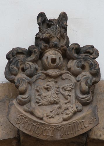 Abb. links: Wappen für die Herrschaft Pleißen im September 2016, Abb. rechts: das gleiche Wappen im September 2018, gerade ganz neu angestrichen. Das Jenaer Ehepaar Irene und Gerd Hantsche finanzierte die Wiederherstellung durch den Restaurator Michael Bruckschlegel. Die Kosten beliefen sich für dieses Wappen auf 2250 .