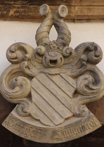 Abb. links: Wappen der Herrschaft Torgau ("Herrschafft Torgau") über der ersten Arkade von links. Das Motiv taucht normalerweise nicht in vermehrten ernestinischen Wappen auf. Im Sächsischen Stammbuch wird ein anderes Motiv abgebildet ("Torgaw"), es zeigt dort in Gold einen in vier Reihen rot-silbern nach der Figur geschachten Schrägbalken. Dieses Wappen findet sich auch in anderen Quellen, aber mit zwei Reihen Schach (Siebmacher Band: BraA Seite: 96 Tafel: 58, Band: SaA Seite: 169 Tafel: 109). Ebenso wird es in den Unterlagen der Forschungsbibliothek Gotha dargestellt, dazu rot-silberne Helmdecken und ein roter, silbern aufgeschlagener Turnierhut, darauf eine Krone, aus der fächerförmig drei Pfauenwedel mit goldenem Schaft und naturfarbenen Pfauenfederbüscheln hervorkommen. So ähnlich ist das Wappen auch im Wappensaal Lauf zu sehen. Hier sind in stark verwittertem Feld jedoch zwei Löwen übereinander zu sehen; das Kleinod ist gänzlich verlorengegangen. Beschriftung (viel besser erhalten als das Wappen, vermutlich nachgearbeitet) und Inhalt bilden kein plausibles Paar, offensichtlich ist hier eine unzutreffende Vorlage verwendet und das Motiv verwechselt worden. Burg und Stadt Torgau kamen 1289 an die Wettiner, unter Friedrich dem Freidigen. Die Herren von Torgau sind 1348 ausgestorben, und ihr einstiges Herrschaftsgebiet fiel komplett an die Wettiner. 1485 kam Torgau in der Leipziger Teilung an die Ernestiner; und Schloß Hartenfels wurde zu einer der wichtigen Residenzen ausgebaut, neben Coburg, Wittenberg und Gotha einer der Eckpfeiler der ernestinischen Landesherrschaft. Nach der Niederlage im Schmalkaldischen Krieg kam Torgau 1547 an die Albertiner. 1815 kam Torgau an Preußen. Der Wappenstein wurde in der Mitte des 18. Jh. neu geschaffen und wirkt gegenüber den älteren Steinen in seiner Formgebung etwas barocker. Was ist aber nun wirklich als Vorlage verwendet worden? Die Herren von Torgau kannte niemand mehr so richtig in der Mitte des 18. Jh., also fiel man vermutlich auf ein namensähnliches Wappen herein. Zum einen gibt es zwei Löwen im Wappen von Turgau, schrägrechts geteilt von Silber und Blau mit zwei Löwen in verwechselter Tinktur (lt. Siebmacher SouvAd, heute andere Farben). Zum anderen ist ein Wappen der süddeutschen Grafen von Turgow überliefert mit zwei silbernen Löwen übereinander in blauem Feld, Helmzier ein wachsender silberner Löwe zu blau-silbernen Decken. Die Helmzier war verloren gegangen; der Rest der Helmkrone wurde 1999 zu einer Art Mini-Hut ummodelliert. Fazit: In jederlei Hinsicht falsches Wappen.