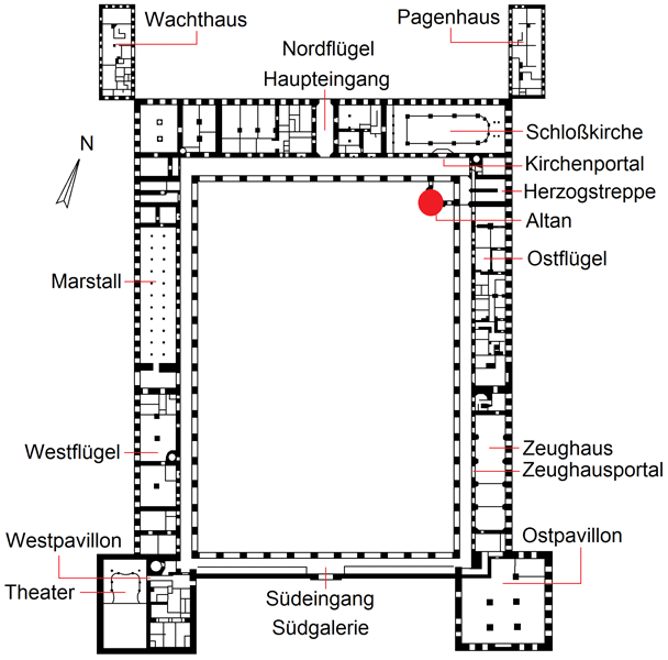 Die jüngste bauliche Zutat im Innenhof des Schlosses Friedenstein ist der 1896 errichtete Altan im Nordosteck. Er durchbricht die Regelmäßigkeit des Schloßhofes mit seinen Arkaden und seiner Hauptöffnung 45° schräg versetzt in Bezug zu den Arkaden. Einerseits zerstört der Bau die ausgeglichene Symmetrie des Hofes, andererseits baut er ein optisches Ziel in der Weitläufigkeit der Fläche auf und betont die wichtigste Stelle, denn hier beginnt die Herzogstreppe, hier führt der Weg nach oben in die Prunkräume, hier liegt der thematische Schwerpunkt, und hier sind auch die wichtigsten Wappen über den Arkaden anzutreffen.