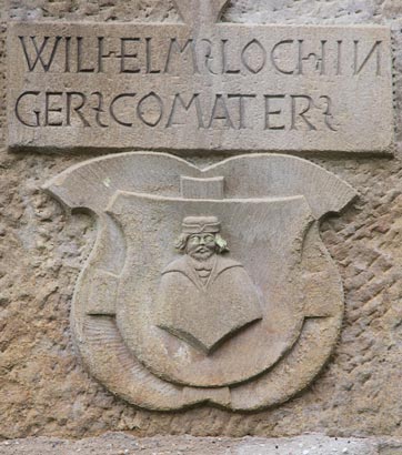 Das dritte Wappen erinnert an "WILHELM LOCHINGER COMATER". Wilhelm von Lochinger, hier noch als einfacher Komtur gelistet, war vorher 1525-1529 bzw. 1531-1532 Komtur in Rothenburg, 1535-1537 Komtur in Oettingen und wurde später 1555-1558 Landkomtur der Ballei Franken, als Nachfolger von Eberhard von Ehingen. Die in Archshofen nordwestlich von Rothenburg beheimatete und im Mannesstamm 1688 erloschene Familie führte in Gold einen schwarzgekleideten Mannesrumpf mit goldenem Kragen und niederem schwarzem, goldengestulptem Hut, auf dem Helm mit schwarz-goldenen Decken wachsend ein schwarzgekleideter Mannesrumpf mit goldenem Kragen und niederem schwarzem, goldengestulptem Hut - so wird es im Geschlechterbuch des Johann Friedrich Christoph Schrag abgebildet. Ähnlich wird es im Siebmacher Si1 105 "Frenckische" sowie im Siebmacher Band: WüA Seite: 57 Tafel: 38 und Band: BayA1 Seite: 160 Tafel: 166 beschrieben, doch dort sind Aufschlag und Krempe jeweils grün.