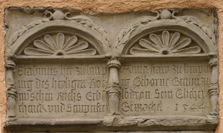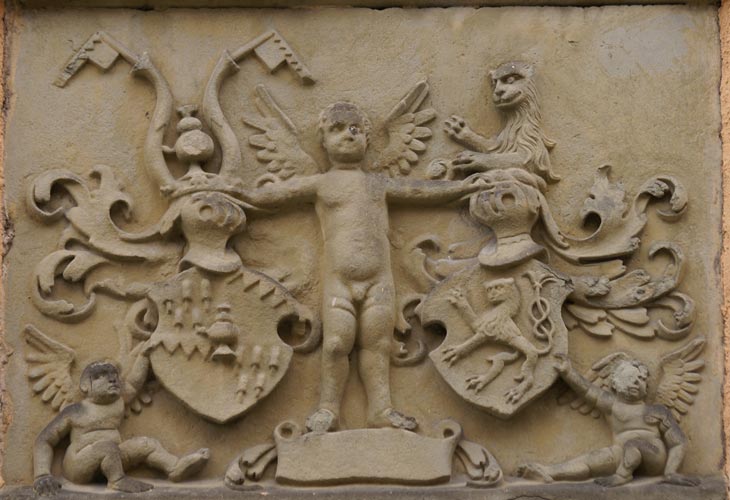 Insgesamt gibt es drei Wappensteine am Schloß, eine Stiftertafel am Torturm von 1562 mit zwei Einzelwappen, eine Stiftertafel am Treppenturm vor dem Erasmusbau von 1544 mit ebenfalls zwei Einzelwappen und eine dritte Tafel am Bau gegenüber von 1592 mit drei Einzelwappen. Beginnen wir mit dem zeitlich ältesten Wappenstein, demjenigen am Erasmusbau. Der Stein ist in zwei Zonen geteilt, die Wappenzone unten und die Inschriftenzone oben. Unten steht mittig auf einem Schriftband, dessen Inhalt verloren gegangen ist, ein nackter geflügelter Putto und hält mit ausgestreckten Armen die beiden Vollwappen am Helm fest. Zu beiden seiten sitzen am Boden zwei weitere geflügelte Putten, die jeweils den äußeren Arm auf den Boden stützen und mit der inneren Hand den Schild seitlich ergreifen.