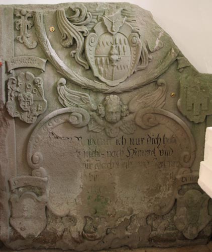 Ein paar Fragmente von Grabplatten sind im Vorraum zum Trauzimmer aufgestellt. Eine davon (Abb. oben) ist für Wilhelm von Limpurg-Sontheim (10.6.1568-14.2.1633), 1606-1617 württembergischer Obervogt zu Göppingen, Sohn von Friedrich VII. Schenk von Limpurg-Obersontheim (6.8.1536-29.1.1596) und Agnes von Limpurg-Gaildorf (21.11.1542-6.10.1606). Die vier Ahnenwappen sind oben Schenk von Limpurg (zerstört) und Schenk von Limpurg sowie unten von Lodron (schlecht erhalten) und della Scala (Leiter mit Hunden noch gut zu sehen). Die Eltern waren Friedrich VI. Schenk von Limpurg-Obersontheim (6.8.1536-29.1.1596) und Agnes von Limpurg-Gaildorf (21.11.1542-6.10.1606). Die vier Großeltern waren Erasmus I. Schenk von Limpurg-Obersontheim (14.1.1502-25.2.1553), Anne von Lodron (-12.11.1556), Wilhelm III. Schenk von Limpurg-Gaildorf (12.4.1498-9.3.1552) und Anna della Scala. In der fehlenden oberen Hälfte der Platte ist allein das Voll- oder Ehewappen Wilhelms zu vermuten, weil die Ahnenprobe komplett ist.