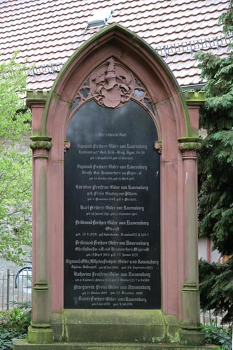 Auch über der Gruft für mehrere Familienmitglieder befindet sich das aus Sandstein gehauene Wappen der Göler von Ravensburg wie beschrieben im Maßwerk eines neogotischen Spitzbogens. Hier liegen Sigmund Freiherr Göler von Ravensburg (8.8.1876-27.5.1905), Leutnant im ersten Badischen Leib-Dragoner-Regiment Nr. 20, Sigmund Freiherr Göler von Ravensburg (24.10.1831-21.4.1906), großherzoglich-badischer Kammerherr und Major, Caroline Freifrau Göler von Ravensburg geborene Freiin Gayling von Altheim (4.11.1848-4.5.1922), Karl Freiherr Göler von Ravensburg (29.1.1893-13.9.1908), Ferdinand Freiherr Göler von Ravensburg (10.2.1898-25.11.1942), Oberst, gefallen in Rußland, Ferdinand Freiherr Göler von Ravensburg (15.4.41869-22.1.1951), Oberstallmeister a. D. und Kammerherr Major a. D., Sigmund Otto Wilhelm Freiherr Göler von Ravensburg (16.6.1900-24.9.1951), Diplom-Volkswirt, Katharina Freifrau Göler von Ravensburg (13.2.1874-17.10.1952), Margareta Freiin Göler von Ravensburg (21.10.1908-22.12.1995) und Ravan Freiherr Göler von Ravensburg (5.7.1928-9.7.1991).