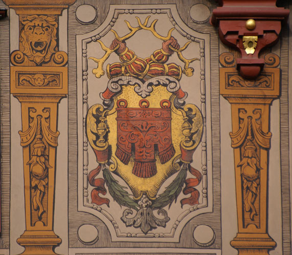Zwei weitere Wappendarstellungen sind im Zwerchgiebel beiderseits der heute noch funktionsfähigen astronomischen Uhr als Fassadenmalerei angebracht. Das optisch rechte wiederholt das Tübinger Stadtwappen. Es gibt eine Abweichung zur üblichen und heute festgeschriebenen Darstellung, bei der die beiden dem württembergischen Herzogswappen entlehnten Hirschstangen schwarz sind, nicht golden wie hier bei der Fassadenmalerei.