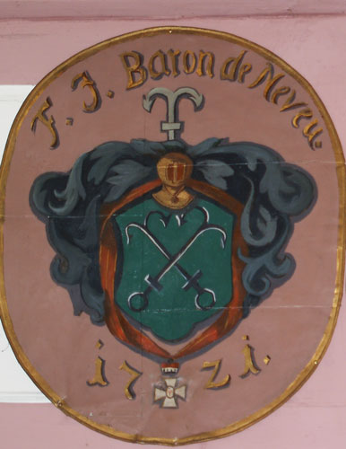Abb. links oben: Tafel 71: Position innen links, Aufschwörschild für "F. J. Baron de Neveu" = Franz Joseph Freiherr von Neveu, datiert auf 1721. Blasonierung: In Grün zwei schräggekreuzte, gestürzte, silberne Anker mit goldenen Spitzen und Ringen, auf dem gekrönten Helm mit grün-silbernen Decken ein gestürzter, silberner Anker mit goldenen Flunken und Ringen. Nachweis: Siebmacher Band: Bad Seite: 11 Tafel: 8. Rietstap: " De sinople à deux ancres d'argent les bouts d'or renversées et passées en sautoir. Casque couronné. Cimier une ancre de l'écu renversée et mise en pal".