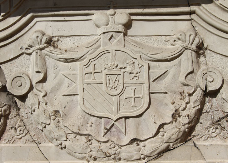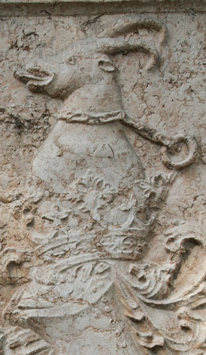 Der letzte Teil dieser Zeile und die ganze nachfolgende Zeile sind unbehauen, um die Daten der Witwe im Todesfall bei Gelegenheit nachzutragen, was aber offensichtlich nie geschah. Unten in der Mitte des unteren Kartuschenrandes schaut ein Bockskopf den Betrachter frontal an, oben ist an entsprechender Stelle eine Löwenmaske herausgehauen.