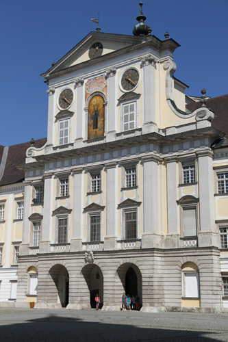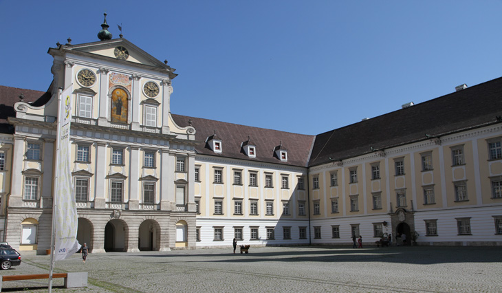 Abb.: Prälatenhof (innerer Stiftshof), Nordflügel mit Brückentor, links Gästeflügel.