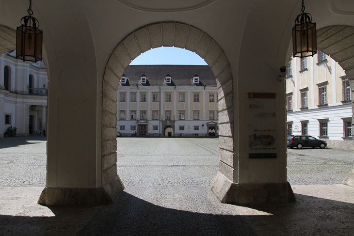 Abb.: äußerer Stiftshof, Blick von der Portierbrücke über den ehemaligen Wassergraben zum Schmiedhof mit den Prandtauer-Arkaden.