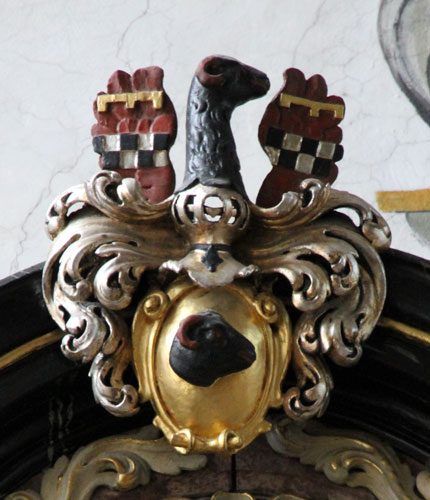 Die Familie führt den Schild schwarz-golden geteilt mit drei (2:1) Ringen in verwechselten Farben, auf dem Helm mit schwarz-goldenen Decken zwei wachsende Schwanenhälse nebeneinander, hier rechts silbern, links rot (auch umgekehrt vorkommend). Hier wird das Oberwappen ergänzt um einen zweiten Helm, der eine Inful trägt. Es ist das einzige Wappen eines Propstes mit diesem zusätzlichen Helm.