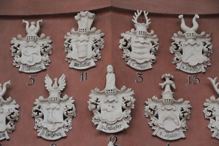 Alle 17 Wappendarstellungen am Epitaph sind aus Alabaster gefertigt und heben sich strahlend hell vom roten Sandsteinuntergrund ab. Das zentrale Wappen vor dem Aufsatz ist das der von Buttlar.