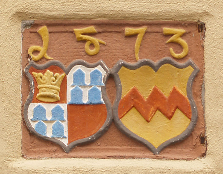 Am Haus befinden sich zwei identische Wappensteine, von denen nur der linke farbig gefaßt ist. Das Wappen der von Cronberg ist geviert, Feld 1: in Rot eine goldene Krone, Feld 2 und 3: in Silber 4 (2:2) blaue Eisenhütlein (silbern-blauer pfahlförmig angeordneter Eisenhutfeh), Feld 4: ledig und rot. Die hier nicht dargestellte Helmzier wäre zu rot-silbernen Decken ein schwarzer Federbusch, auch als eine schwarze Zirbelnuß interpretiert. Das Wappen der Brendel von Homburg zeigt in Gold einen roten Zickzackbalken. Die hier nicht dargestellte Helmzier wäre zu rot-goldenen Decken ein goldener, beiderseits mit einem roten Zickzackbalken belegter Flug.