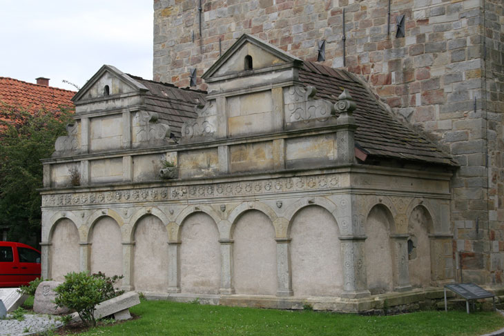 Die dem Turm vorgebaute, im Stil der Weserrenaissance erbaute Grablege entstand im Jahre 1606 als Gruftbau. Der mit rundbogigen Blendarkaden, sechs an der Vorderseite (Westseite) und je zwei an den Seiten (Norden und Süden), versehene Unterbau wird auf der Vorderseite oben mit einem Wappenfries abgeschlossen, welcher 32 Vollwappen in einer einzigen Reihe enthält, aber nicht auf den Seiten fortgesetzt wird. Die Blendarkaden sind mit Ornamenten aus Beschlagwerk versehen. In den Schlußsteinen der Bögen wechseln sich Kugelbossen und Pyramidenbossen ab. Die obere Zone bilden zwei die dahinterliegenden Satteldächer cachierende Giebel nebeneinander, mit Beschlagwerk auf den geschwungenen Seitenteilen und schlichtem Dreiecksgiebel als oberem Abschluß. In der Mitte zwischen den beiden Dächern ragt ein Wasserspeier vor, der das Regenwasser zwischen den beiden Dächern genau zwischen den beiden Wappen des Bauherren-Ehepaares herausleitet.