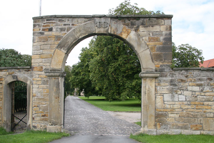 Von Osten her kommend, passiert man zunächst ein Rundbogentor mit kleiner Fußgängerpforte links daneben. Den keilförmig vergrößerten Schlußstein ziert ein Wappenpaar. Die nur noch schwer lesbare Inschrift lautet: "LUDEWIG FREIHERR VON HAMMERSTEIN ZU GESMOLDT UND APELERN - DOROTHEA SOPHIE ERNESTINE VON MÜNGHAUSEN AUS RINTELN ANNO 1774". Ludwig von Hammerstein-Gesmold (5.8.1702-3.6.1786) war der Sohn von Christoph Ludolph von Hammerstein (2.5.1646-21.8.1728) und Johanna Sophie Schenk von Winterstetten (22.11.1662-27.5.1708). Er heiratete in erster Ehe am 19.11.1730 Anna Eleonore von Heimberg und nach deren Tod (Ehe ohne Nachkommen) in zweiter Ehe am 10.12.1740 Dorothee Sophie Ernestine von Münchhausen (11.6.1717-17.3.1795) aus Rinteln, eine Tochter von Georg Otto von Münchhausen (9.11.1682-21.9.1724), Herr auf Rinteln und Bodenwerder, königlich Großbritannischer und herzoglich braunschweigisch-lüneburgischer bzw. kurfürstlich-hannoverscher Oberstleutnant (Obrist) der Kavallerie, und Sibylle Wilhelmine von Rheden (19.6.1689-26.4.1741). Ludwig war Herr auf Hornoldendorf, Gesmold und Apelern, später auch auf Hammerstein und Stakenburg. Er war kaiserlicher Wirklicher Kammerherr des Johanniterordens und kurbraunschweigischer Schloßhauptmann. Ludwig und Dorothee hatten 10 Kinder, von denen Georg Gottlieb Maximilian von Hammerstein (20.2.1754-9.9.1783) das Gut in Apelern übernahm.