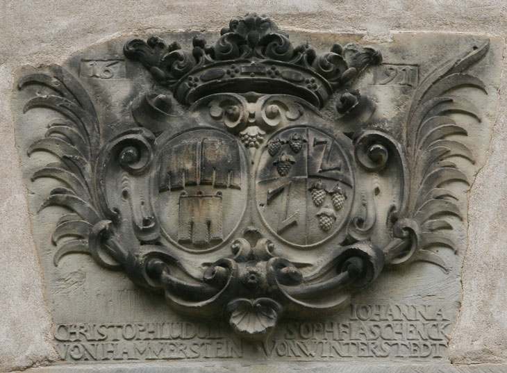 Der zweite Wappenstein darüber bringt ein neues Wappen ins Spiel, außerdem ist er um Klassen besser gearbeitet. Er ist kleiner als der untere, aber künstlerisch geschlossener und gelungener. Zwei Ovalkartuschen werden unter einer gemeinsamen Krone zusammengestellt und von zwei Palmzweigen flankiert. Die Steinmetzarbeit wirkt wesentlich dynamischer, plastischer und zugleich kompakter, insgesamt kraftvoller als der Wappenstein darunter. Die Inschrift ordnet ihn wie folgt zu: "1691 - CHRISTOPH LUDOLPH VON HAMMERSTEIN - IOHANNA SOPHFIA SCHENCK VON WINTERSTEDT". Christoph Ludolph von Hammerstein (2.5.1646-21.8.1728), Sohn von Hans Adam von Hammerstein-Equord (19.7.1579-10.2.1653), Herr auf Equord, und dessen dritter Ehefrau Levecke von Münchhausen (14.1.1616-18.12.1675), war der zweite Herr von Hammerstein auf Apelern. Weil der Erwerber des Besitzes kinderlos war, hinterließ er ihn seinem Vetter Christoph Ludolph. Dieser heiratete Johanna Sophie Schenk von Winterstetten (22.11.1662-27.5.1708), die Tochter von Freiherr Ludwig Schenck von Winterstetten (1619-25.5.1665) und Anna Catharina von Voss (15.7.1633-7.10.1665), Erbin von Quakenbrück. Christoph Ludolph von Hammerstein war Herr auf Hornoldendorf, Gesmold, Dratum und Apelern. Er war kurbraunschweigischer Oberst und zuletzt Generaladjutant in Celleschen Diensten. Das Paar hatte 17 Kinder.