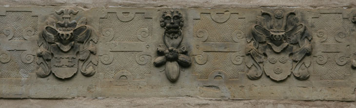 Über der Tür am polygonalen Treppenturm, die ein reich gestäbtes Gewände mit sich überschneidenden Bögen und geraden Elementen und einer oben angebrachten Datierung auf "ANNO D(OMI)NI 1590" besitzt, ist ein Wappenstein aus dem Jahr 1670 angebracht, der nur den gekrönten ovalen Wappenschild der von Hammerstein wie beschrieben trägt, nebst der inschriftlichen Zuordnung "FRIDERICH CHRISTOF VON HAMMERSTEIN GENERAL MAIOR AN(N)O 1670".