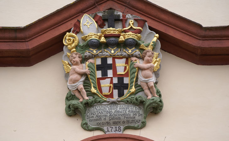 Die munter Klein- und Großbuchstaben mischende Inschrift unter dem Wappen lautet: "SVb / REVERENDIssIMO et Celsissimo / Sacri Romani Imperii principe ac D(omino) D(omino) / CONSTANTINO ABBaTE fuldensi /Divae Augustae Archicancellario per Ger/maniam et Galliam Primate / ex avita stirpe de ButtlAr /1718"- unter dem hochwürdigsten und hochgerühmten Herrn und dem Fürsten des Heiligen Römischen Reiches, dem Herrn Constantin aus dem uralten Geschlecht der von Buttlar, Abt von Fulda, Erzkanzler der Kaiserin und Primas von Germanien und Gallien (erbaut) 1718.