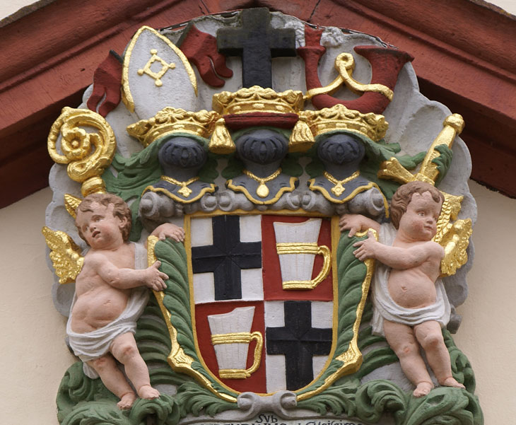 Zu sehen ist jedenfalls ein geviertes Wappen, das wie folgt aufgebaut ist: Feld 1: der oben diskutierte Vogel einwärts, Sittich oder Henne, Feld 2 und 3: in Silber ein durchgehendes schwarzes Kreuz (Hochstift Fulda), Feld 4: in Rot aus einem grünen Dreiberg wachsend drei silberne Lilien an grünen Stengeln (für die römischen Geschwister und Märtyrer Simplizius, Faustinus und Beatrix, die drei Schutzpatrone der Stadt, Symbol des Domkapitels, vgl. Stadtwappen). Ungewöhnlich an diesem Wappen ist die Positionierung des hochstiftlichen Feldes und die Aufnahme der Lilien.
