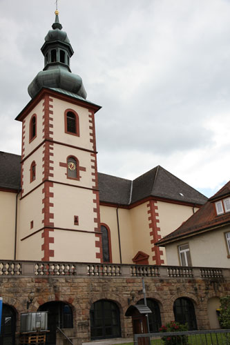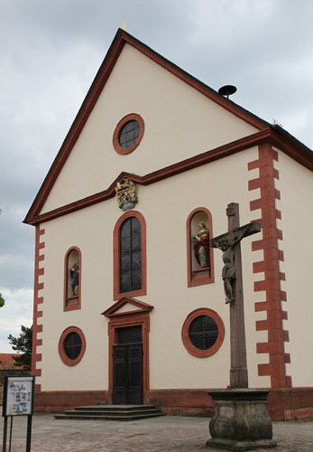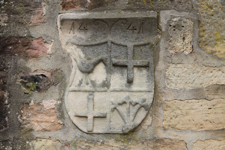 An dem Mäuerchen zwischen Kreuzkapelle und Pfarrhaus ist neben dem Torbogen ein älterer Wappenstein eingemauert, dem Aussehen nach spätgotisch, der nachträglich überarbeitet worden ist. Die Schreibweise der Jahreszahl 1441 entspricht jedenfalls nicht der damals üblichen Form. Unter der ersten Ziffer "4" ist die gotische Ziffer noch ansatzweise zu erkennen. In dem angegebenen Jahr, sofern vor der Änderung korrekt gelesen, war Hermann II. von Buchenau Fuldaer Fürstabt. Er regierte von 1440 bis 1449. Dann müßte aber in Feld 1 in Gold einwärts ein grüner Sittich mit Halsband (von Buchenau) zu sehen sein - fragwürdig. Angesichts des erhaltenen Befundes ähnelt das Motiv aber mehr einer Henne, so daß der Verdacht besteht, der "Restaurator" hat die dritte Ziffer als "4" gelesen, obwohl es sich um eine verwitterte "8" gehandelt haben könnte - denn die gotische "4" sieht wie eine unten offene "8" aus. Das kann leider nicht mehr verifiziert werden, weil keinerlei Spuren der alten Zahlen in diesem Bereich erhalten sind. Mit der Rekonstruktion der ursprünglichen Jahreszahl als 1481 wäre die Henne plausibel, denn Johann II. von Henneberg-Schleusingen regierte Fulda 1472-1513 als Fürstabt. Er führte in Gold eine schwarze Henne. Was diese Interpretation wiederum unsicher werden läßt, ist die Tatsache, daß die Henneberg-Äbte ein zusätzliches Feld mit einem Adler über zwei Reihen rot-silbernem Schach verwendeten, was hier komplett fehlt. Die Diskussion bleibt offen.