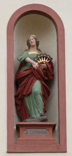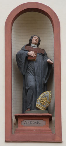 Von heraldischem Interesse ist die Nordfassade. Über dem Hauptportal mit Dreiecksgiebel ist ein Rundbogenfenster eingebaut. Drei Rundfenster, zwei seitlich neben dem Portal und eines im schlichten Dreiecksgiebel, sorgen für weiteres Licht. Über den seitlichen Rundfenstern sind in Rundbogennischen Figuren des heiligen Goar (links) und der heiligen Katharina (rechts) zu sehen, ersterer in Mönchsgewand, mit der Rechten ein Buch gegen die Brust drückend, eine Mitra zu seinen Füßen abgelegt, letztere mit einem Teilstück eines Rades.