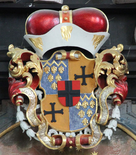 Seitlich ragen rechts der Krummstab und links das gestürzte Schwert hinter den Helmdecken hervor. Die ganze Komposition wird ummantelt von einem aus einem Fürstenhut herabfallenden, beiderseits mit Bändern hochgerafften, roten, hermelingefütterten Wappenmantel. In dieser Form handelt es sich um das aufwendigste Wappen, das dieser Fürstabt führte, sozusagen mit allem, was möglich war. Das Wappen ist in die schneckenförmig eingerollten Enden des gesprengten und verkröpften Segmentbogengiebels eingepaßt. Die Zwickel rechts und links lassen noch Platz für je einen geflügelten Putto, der mit der inneren Hand den Wappenmantel haltend greift und mit der äußeren Hand sein Hüfttuch zum Betrachter hin in den Raum zieht.