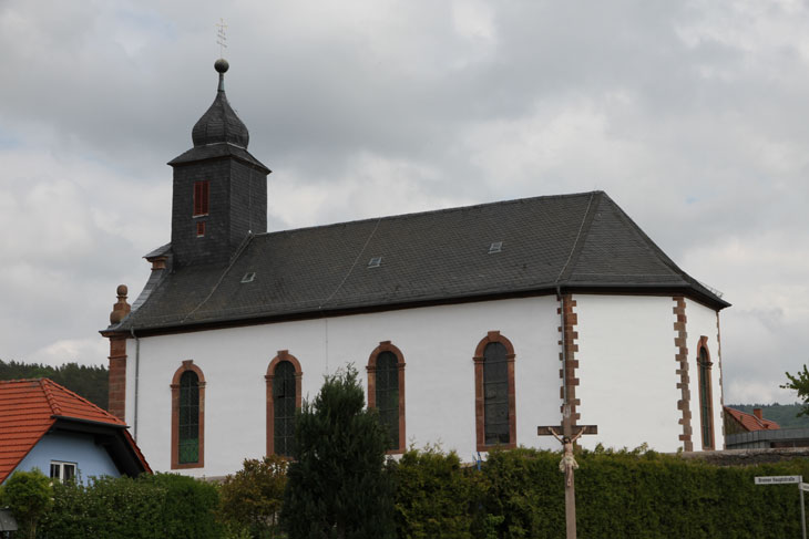 Das an dieser Kirche trotz der geringen Größe besonders prunkvoll geratene Wappen über dem Portal ist dasjenige des Fuldaer Fürstabtes Anton Adolph Kämmerer von Worms gen. von Dalberg (29.5.1678-3.11.1737, regierte 1726-1737). Er führt sein Wappen geviert mit Herzschild, Feld 1 und 4: unter einem goldenen, mit drei Spitzen abgeteilten Schildhaupt in Blau sechs (3:2:1) silberne Lilien, Stammwappen der Kämmerer von Worms, Feld 2 und 3: in Gold ein schwarzes Ankerkreuz, Stammwappen der von Dalberg, Herzschild: in Silber ein schwarzes durchgehendes Kreuz, Fürstabtei Fulda. Diesen prunkvollen Wappenstein fertigte der Bildhauer Christian Baus aus Kaltennordheim an, ebenso die Engel an der Fassade.