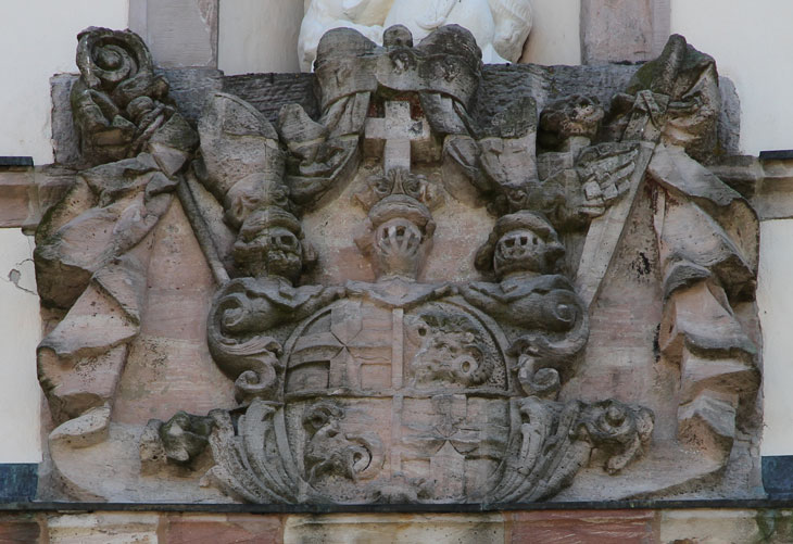 Das Wappen des Fuldaer Fürstabts Amand von Buseck, das außen an der Fassade hoch über dem Eingang, schon jenseits des Hauptgesimses in der Attikazone des Giebels, angebracht ist, ist geviert, Feld 1 und 4: in Silber ein schwarzes durchgehendes Kreuz (Hochstift Fulda), Feld 2 und 3: in Gold ein rot gezungter, schwarzer Widderkopf, Hörner schwarz oder rot (Stammwappen der von Buseck). Dazu werden drei Helme geführt: Helm 1 (Mitte): auf dem Helm mit schwarz-silbernen Decken auf einem roten Kissen eine goldene Krone, aus der ein schwarzes, lateinisches Kreuz herausragt (Hochstift Fulda), Helm 2 (rechts): auf dem gekrönten Helm (hier ebenfalls mit Kissen unter der Krone) mit schwarz-silbernen Decken eine Bischofsmütze, aus der eigentlich noch zwei Fähnchen schräg herausragen, die aber hier fehlen, Hochstift Fulda, Helm 3 (links): auf dem gekrönten Helm (hier ebenfalls mit Kissen unter der Krone) mit schwarz-goldenen Decken ein roter Flug, der beiderseits mit einem in drei Reihen schwarz-silbern geschachten Balken und darüber von einem dreilätzigen goldenen Turnierkragen belegt ist, dazwischen Kopf und Hals eines schwarzen Widders, Stammkleinod der von Buseck. Die Helmdecken sind hier so minimalistisch, daß die Grenze zum Fehlen tangiert wird. Hinter dem Schild stehen schräglinks das gestürzte Schwert und schrägrechts der Krummstab. Beide sind hier extrem lang, weil das Wappen von einem aus einem Fürstenhut herabfallenden und beiderseits hochgerafften Wappenmantel umgeben ist und Schwertgriff und Stabkrümme auf den gerafften oberen Teilen zu liegen kommen. Über dem Wappen befindet sich eine Figurennische mit einer sandsteinernen Darstellung Mariens auf einem Drachen.