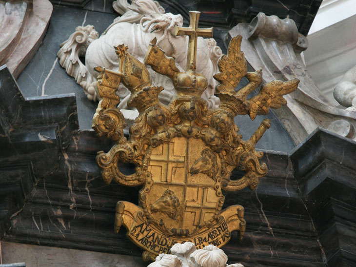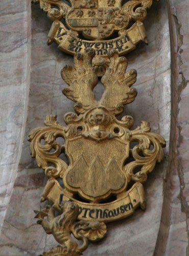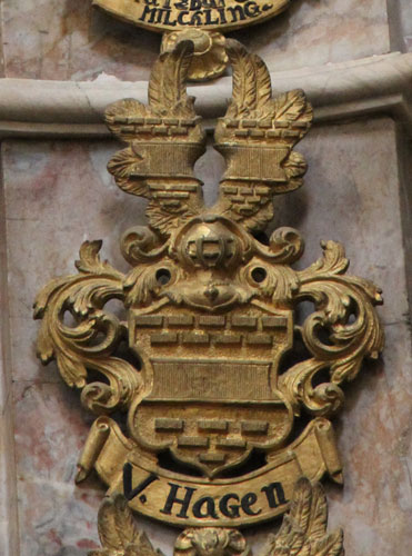 Nun folgen die 8 Wappen der optisch rechten, heraldisch linken Seite, von oben nach unten. Dieser Bereich liegt hinter der abtrennenden Balustrade und kann nicht betreten werden, deshalb sind die nachfolgenden Photos aus der Hand technisch grenzwertig: