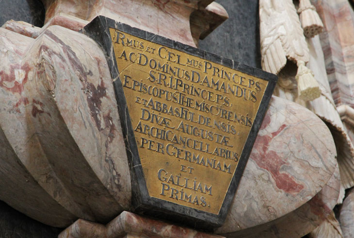 Eine zweite Inschrift ist auf der trapezförmigen Vorderfläche der das Zentralfeld beherrschenden Urne zu lesen: "R(EVERDISSI)MUS ET CEL(SISSI)MUS PRINCEPS / AC DOMINUS D(OMINUS) AMANDUS / S(ACRI) R(OMANI) I(MPERII) PRINCEPS / EPISCOPUS THEMISCYRENSIS / ET ABBAS FULDENSIS / DIVAE AUGUSTAE / ARCHICANCELLARIUS / PER GERMANIAM / ET / GALLIAM / PRIMAS". Diese kleine Inschrift nennt ihn nur als Abt und Weihbischof, wurde also bei der Anfertigung des Epitaphs schon angebracht, während die große Inschrift die Erhebung Fuldas zum Fürstbistum am 5.10.1752 durch Papst Benedikt XIV. und das Todesdatum eingearbeitet hat, also erst nach dem Ableben vollendet wurde. Alle Inschriften sind aus Lahnmarmor herausgearbeitet und mit erhabenen schwarzen Lettern vor goldenem Hintergrund ausgeführt worden; nur der außen umlaufende Rand ist ebenfalls natürlicher schwarzer Marmor mit weißen Adern.