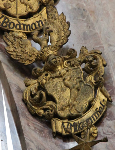 Im Gegensatz zur strengen Logik einer solchen Ahnenprobe (Vater heraldisch rechts vor Mutter heraldisch links, stammesnahe Familien vor stammesfernen Familien) gibt es hier in der letzten Generation einen kleinen Versatz, der zur Vertauschung von zwei Familien führte. Auf beiden Seiten des Epitaphs betrifft der Versatz die gleichen Positionen: 11 und 13 bzw. 12 und 14. Das zeigt, daß die Abweichung systematisch ist. Nun folgen die 8 Wappen der optisch linken, heraldisch rechten Seite, von oben nach unten. Dieser Bereich liegt hinter der abtrennenden Balustrade und kann nicht betreten werden, deshalb sind die nachfolgenden Photos aus der Hand technisch grenzwertig: