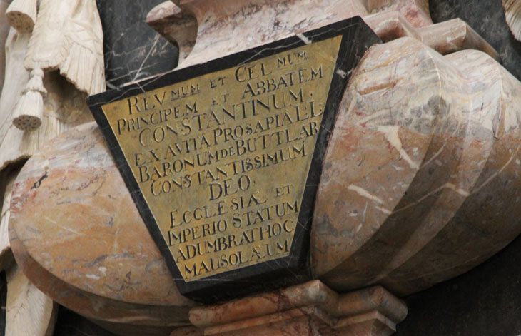 Eine zweite Inschrift ist auf der trapezförmigen Vorderfläche der das Zentralfeld beherrschenden Urne zu lesen: "REV(ERENDISSI)MUM ET CEL(SISSI)MUM / PRINCIPEM ET ABBATEM / CONSTANTINUM / EX AVITA PROSAPIA LL(IBERORUM) / BARONUM DE BUTTLAR / CONSTANTISSIMUM / DEO / ECCLESIAE ET / IMPERIO STATUM / ADUMBRAT HOC / MAUSOLAEUM".