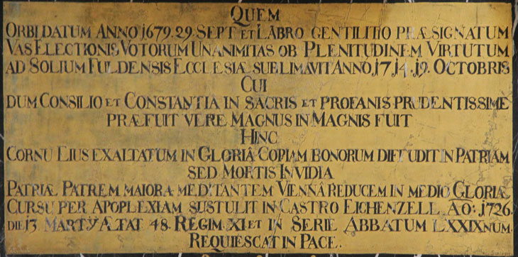 Die große rechteckige Inschrift trägt den Wortlaut: "QUEM / ORBI DATUM ANNO 1679 29 SEPT(EMBRIS) ET LABRO GENTILITIO PRAESIGNATUM / VAS ELECTIONIS VOTORUM UNANIMITAS OB PLENITUDINEM VIRTUTUM / AD SOLIUM FULDENSIS ECCLESIAE SUBLIMAVIT ANNO 1714 19 OCTOBRIS / CUI / DUM CONSILIO ET CONSTANTIA IN SACRIS ET PROFANIS PRUDENTISSIME / PRAEFUIT VERE MAGNUS IN MAGNIS FUIT / HINC / CORNU EIUS EXALTATUM IN GLORIA COPIAM BONORUM DIFFUDIT IN PATRIAM / SED MORTIS IN VIDIA / PATRIAE PATREM MAIORA MEDITANTEM VIENNA REDUCEM IN MEDIO GLORIAE / CURSU PER APOPLEXIAM SUSTULIT IN CASTRO EICHENZELL A(NN)O 1726 / DIE 13 MARTII AETAT(IS) 48 REGIM(INIS) XI ET IN SERIE ABBATUM LXXIXNUM / REQUIESCAT IN PACE". Die Inschrift nennt wichtige Lebensdaten wie das Geburtsdatum 29.9.1679 und seine Wahl am 19.10.1714 dritter Wahltag und beschreibt den Tod durch Apoplex (Schlaganfall), der den 79. Abt in der Reihe der Äbte von Fulda im Alter von nur 48 Jahren in seinem 11. Regierungsjahr am 13.3.1726 in Schloß Eichenzell ereilte, als er von einer Reise nach Wien zurückkehrte und seine Heimatstadt schon fast erreicht hatte.
