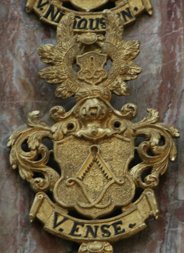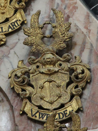 Abb. oben rechts: 8 von Collart: hier gespalten, nach Befund rechts halbgespalten und geteilt, oben rechts geschacht, oben links 9 (3:3:3) punktförmige Objekte, unten blau-golden geschacht, links in Rot ein goldener Hirschkopf mit ebensolchem Geweih, auf dem rot-golden bewulsteten Helm mit rot-goldenen Decken ein goldenes Hirschgeweih (Vergleich mit einer anderen, gemalten Ahnenprobe: dort die rechte Schildhälfte blau-golden geschacht mit einem linken Obereck von Hermelin, weder im Siebmacher noch im Rietstap).