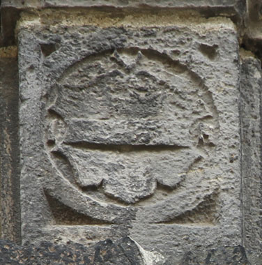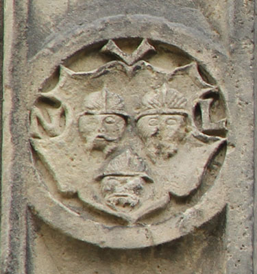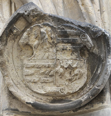Die beiden untersten Wappen in der Mitte der Pilasterabschnitte unter dem Zwischenkapitell sind abgeschlagen (ohne Abb.). Nur die beschädigten Initialen "SW?" und "IVS" zeugen von ihrem einstigen Vorhandensein. Wer damit gemeint ist, ist ohne Wappen nicht zu ermitteln.