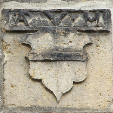 Gegenüber auf gleicher Höhe sind bei dem in gleicher, größerer Aufmachung gestalteten Wappen die Initialen "AVH" (Querstrich mittig nach unten ausgebogen, daher aus der Ferne fast wie ein "M", ist aber ein "H") zu lesen, was zusammen mit dem Balken-Wappen auf die Familie von Heilingen verweisen könnte, die aber gleich noch einmal auftaucht.