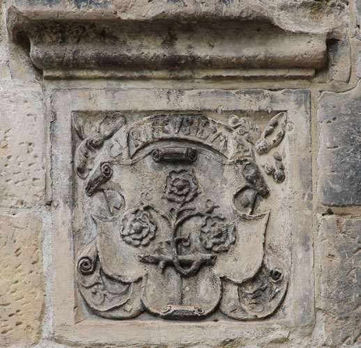 In der nach oben anschließenden Zone der Portalblende wird das Wappen in der Mitte von zwei Pilastern eingerahmt, an die sich seitlich zwei Viertelfächerrosetten anschließen. Oberhalb des Wappens befindet sich noch ein zweites Gebälk, in dessen Zentralfeld die Jahreszahl 1552 zu lesen ist, und darüber wird die Portalgestaltung mit einem rundbogigen Giebelaufsatz mit einer Halbfächerrosette abgeschlossen. Seitlich neben dieser verzieren zwei Kugeln mit doppelter fächerrosettenartiger Gestaltung zum "Äquator" hin und mit einem Abschlußknopf oben den oberen Abschluß. Zwei weitere dieser Kugeln sind im 45°-Winkel seitlich schräg an den tiefergelegenen Viertelrosetten angebracht, und die letzten beiden sind wieder aufrecht neben die Basis der Viertelrosetten gesetzt, so daß insgesamt 7 dieser Kugel-Elemente das Portal verzieren.