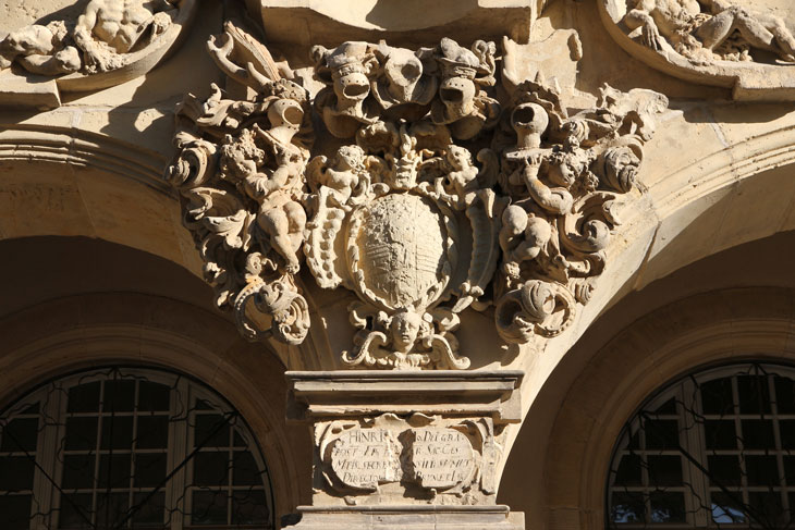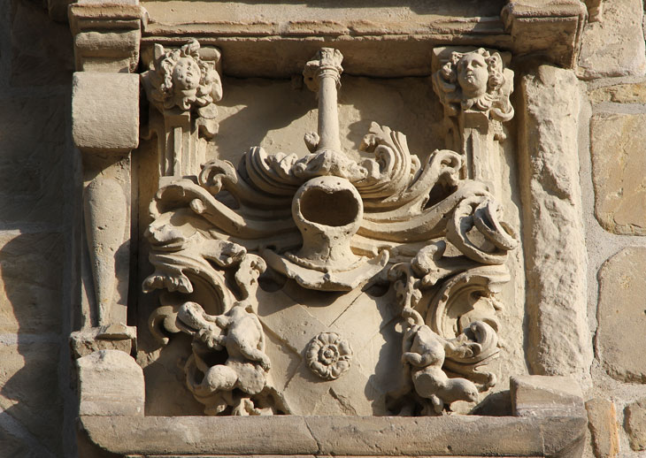 Trotz substantieller Verluste ist die Dekoration des Wappens üppig: Oben zwischen der ovalen Kartusche und dem mittleren Helm ist ein geflügelter Engelskopf eingebaut, unter der Kartusche dient eine groteske Maske als unterer Abschluß.. Seitlich neben der Kartusche erheben sich nackte Frauen mit offenem Haar aus dem Schmuck, nur optisch rechts ist der Kopf erhalten. In die Windungen der Helmdecke integriert sind zwei Putten mit überkreuzten Beinen eingebaut, den Kopf zur Seite gedrückt von der Last der auf ihnen ruhenden äußeren Helme. Auf zwei gebogenen Postamenten seitlich über dem Wappen liegen zwei weitere, halb aufgerichtete, nach innen schauende Figuren.